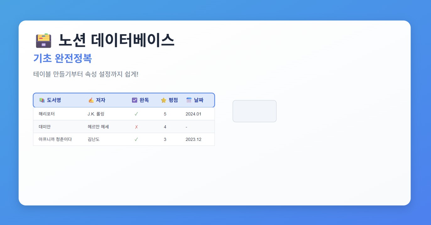 노션에서 나오는 데이터베이스는 엑셀보다 훨씬 똑똑한 표예요! 단순히 정보를 적는 게 아니라, 체크박스도 만들고, 날짜도 관리하고, 파일도 첨부할 수 있어요. 한 번 셋팅만 잘하면 정말 편리하답니다! 😊